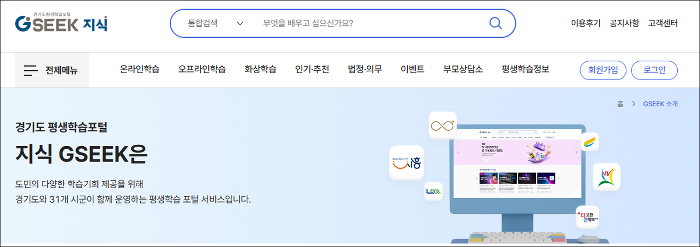 경기도 평생학습포털 gseek 유아부터 어르신까지 온‧오프라인‧실시간 화상학습으로 배움의 즐거움과 다양한 평생학습 기회를 만끽하세요!