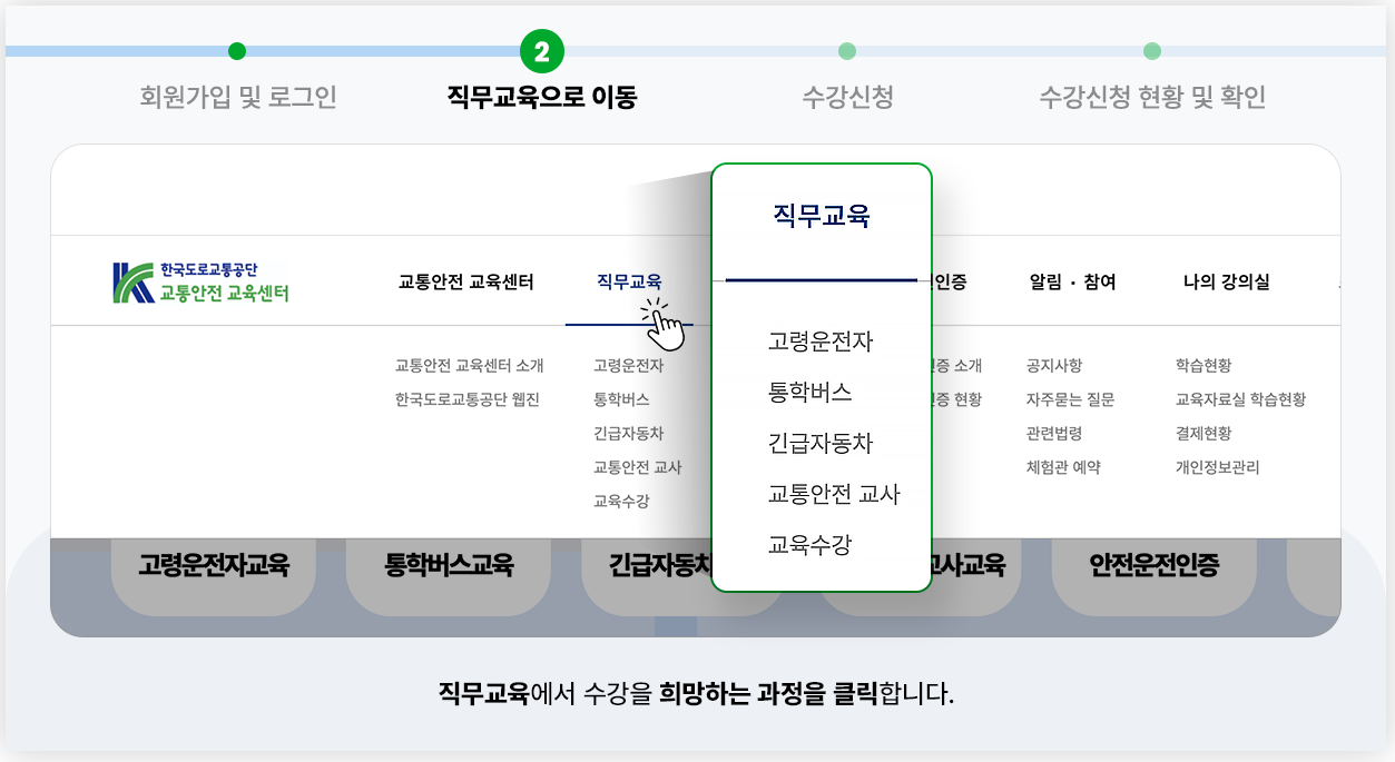교통안전 교육센터 홈페이지는 다음과 같은 교육 과정을 운영하고 있으며, 각 과정은 교육 대상자에게 필요한 내용을 중심으로 구성되어 있습니다.